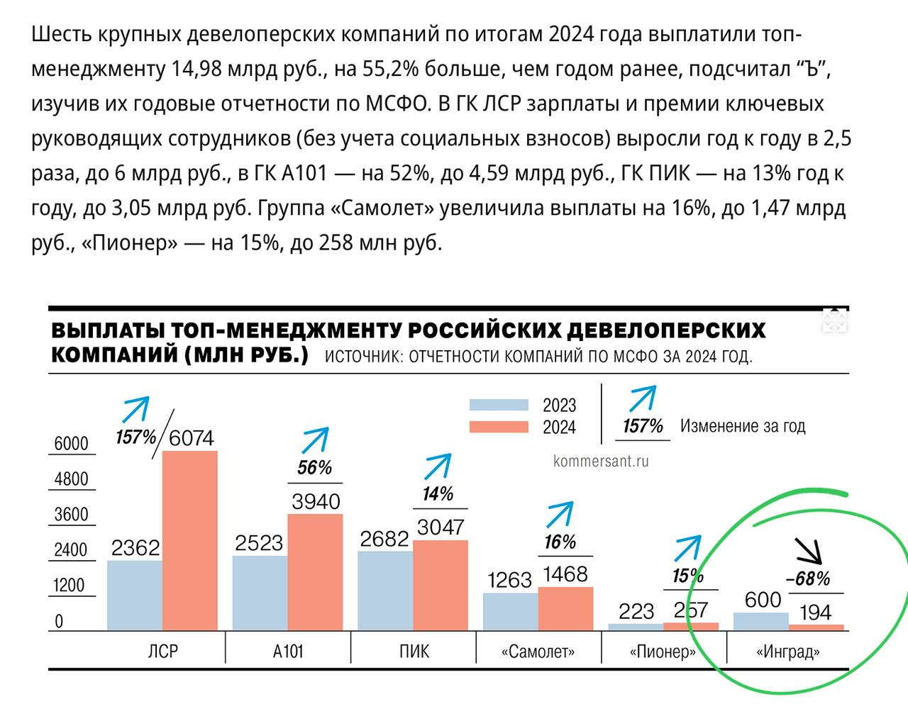 🤓Очень странную ситуацию с выплатами премий топ-менеджменту застройщиков обнаружил Коммерсант. Крупнейшие игроки по итогам 2024 года (который был провальным чуть более, чем наполовину) выплатили бонусов больше, чем в предыдущий год. Объем этого «больше» — разный, однако причина выплат неясна. За что поощрять руководство на фоне падающих продаж, сорванного ввода и снижения динамики старта объектов? Гуляем в последний раз?