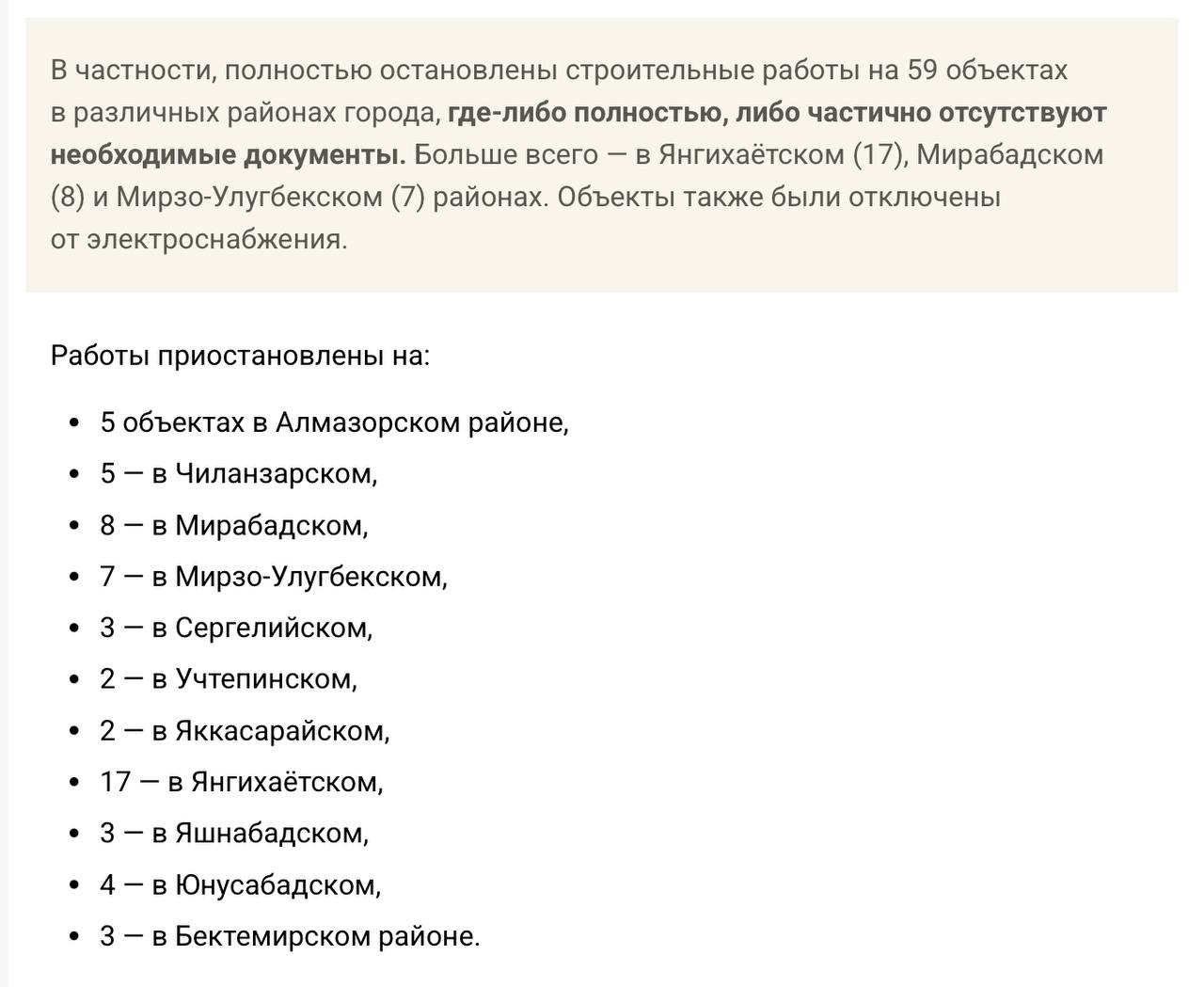 По данным хокимията, в последние месяцы в Ташкенте участились случаи нарушений строительных норм и требований законодательства со стороны некоторых застройщиков. Некоторые из них начали строительство без получения обязательных разрешительных документов, экспертиз и технических заключений, а также пытались незаконно продать жильё гражданам.