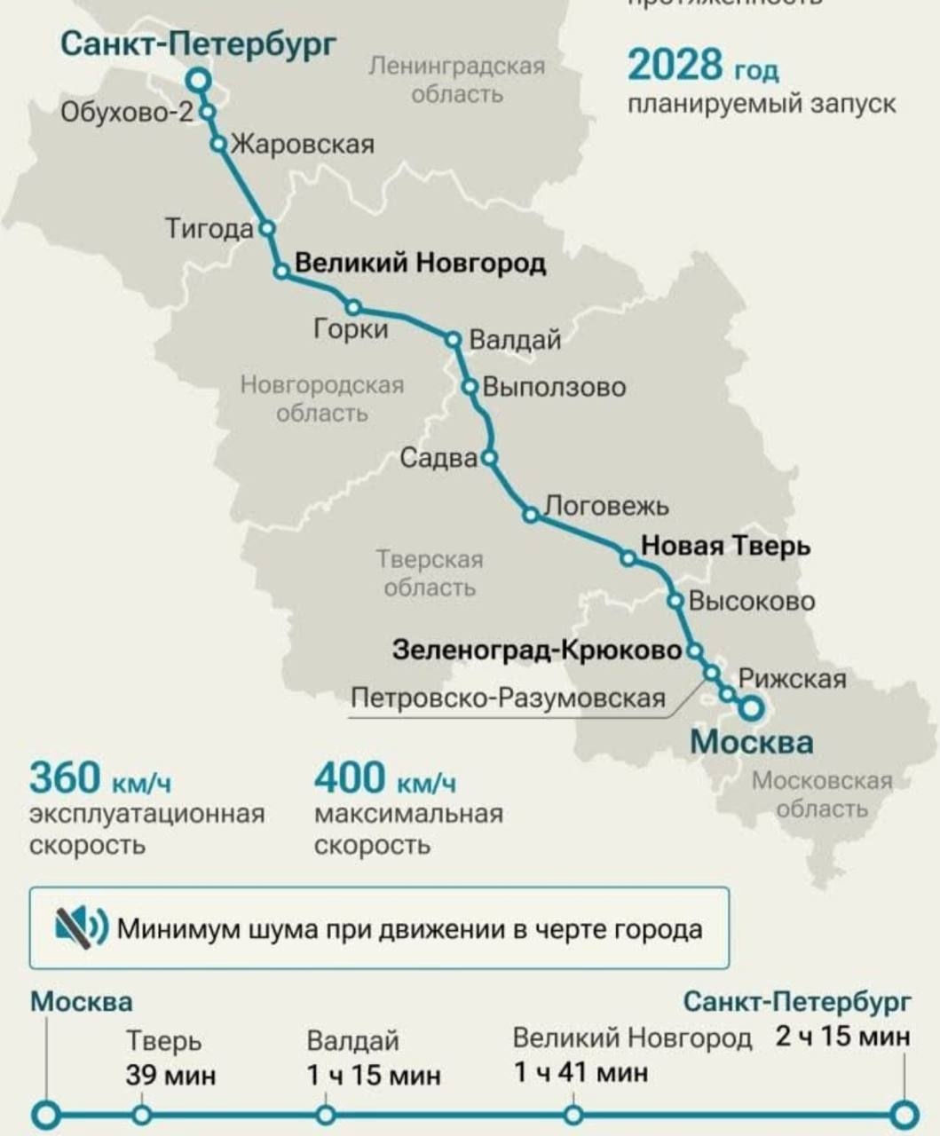 Первый этап сети ВСМ планируется запустить в 2028 году. Магистраль соединит Центральный и Северо-Западный федеральные округа, где проживает почти треть населения страны. Время в пути между Москвой и Санкт-Петербургом сократится до 2 часов 15 минут. Для новой линии разрабатывают самый быстрый в России поезд, который сможет развивать скорость до 400 км/ч.