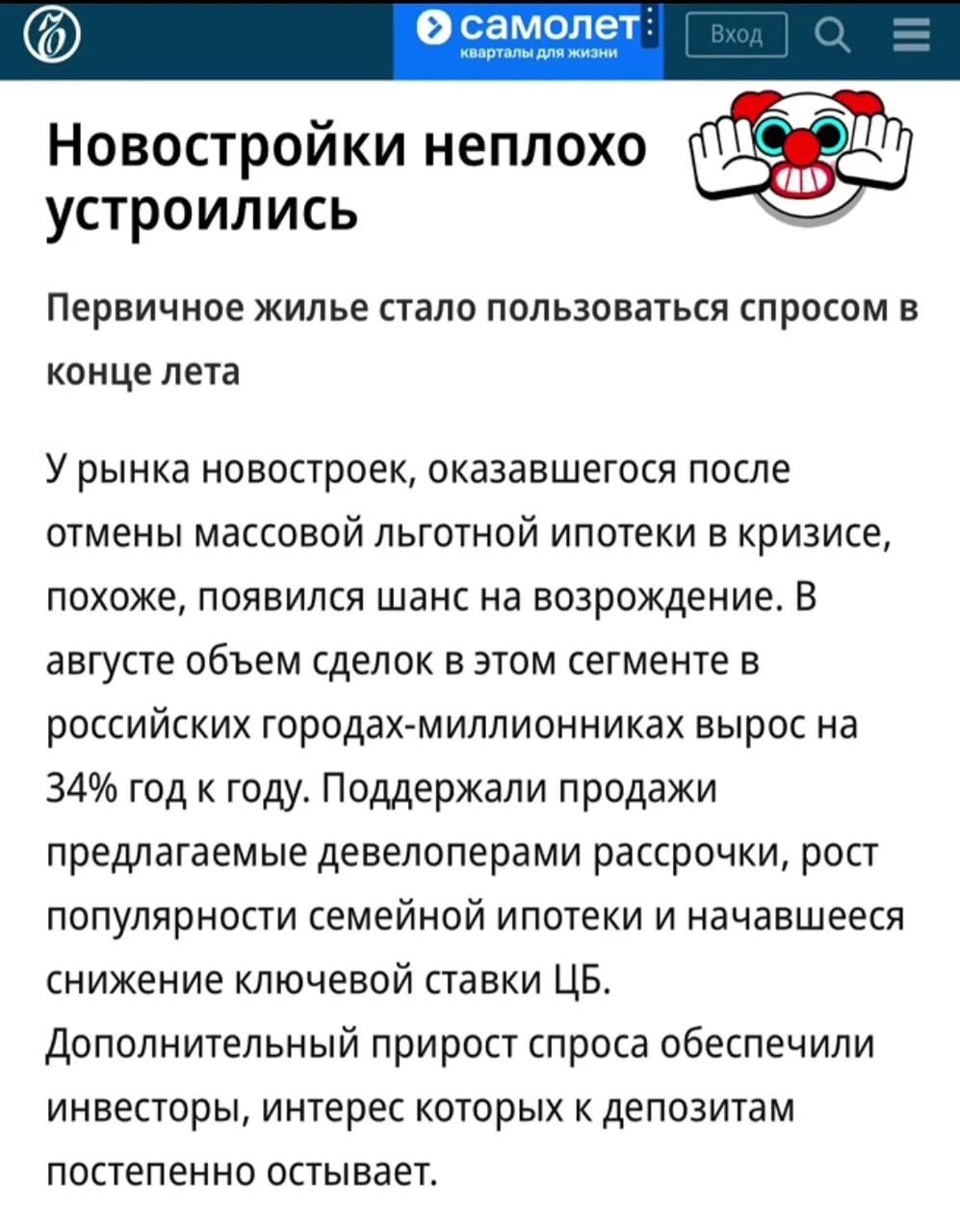 🤓Журналист Коммерсанта полгода в рынке? Захлебываясь оптимизмом автор игнорирует сверхнизкую базу прошлого августа и празднует рост год к году? Напомним, после отмены льготки, рынок вообще на попу сел.
