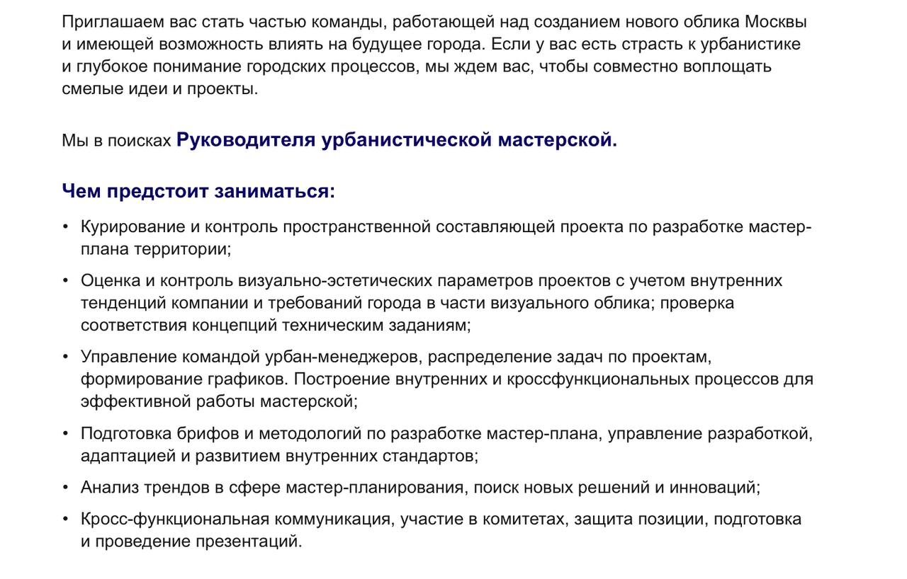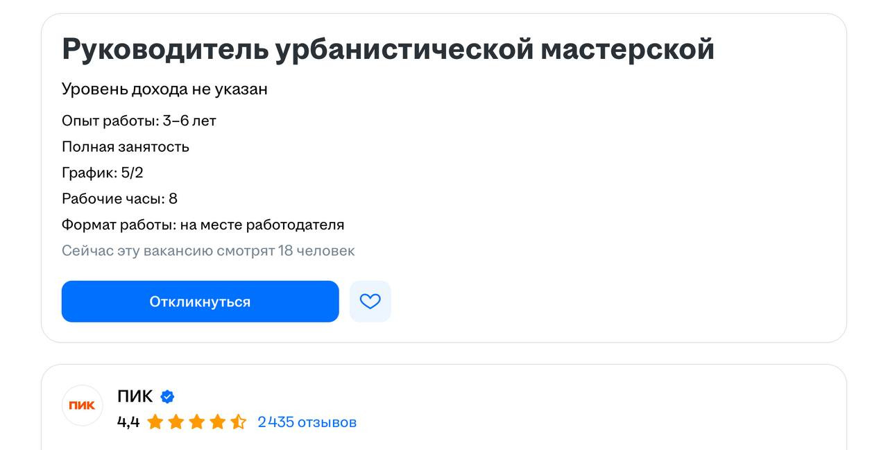 🤓ПИК ищет руководителя урбанистической мастерской. Говорят, у них есть команда, «работающая над созданием нового облика Москвы и имеющая возможность влиять на будущее города». Ого.