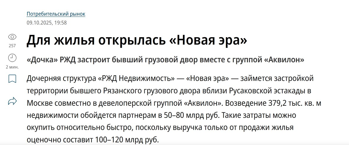 Π‘Π΅Π³ΠΎΠ΄Π½Ρ «ΠΠΎΠ²Π°Ρ ΡΡΠ°» (Π΄ΠΎΡΠ΅ΡΠ½ΡΡ ΠΊΠΎΠΌΠΏΠ°Π½ΠΈΡ «Π ΠΠ ΠΠ΅Π΄Π²ΠΈΠΆΠΈΠΌΠΎΡΡΠΈ») ΠΈ Π΄Π΅Π²Π΅Π»ΠΎΠΏΠ΅ΡΡΠΊΠ°Ρ Π³ΡΡΠΏΠΏΠ° «ΠΠΊΠ²ΠΈΠ»ΠΎΠ½» Π΄ΠΎΠ³ΠΎΠ²ΠΎΡΠΈΠ»ΠΈΡΡ ΠΏΠΎΡΡΡΠΎΠΈΡΡ ΠΎΠΊΠΎΠ»ΠΎ 379 ΡΡΡ. ΠΊΠ². ΠΌ ΠΆΠΈΠ»ΡΡ ΠΈ ΠΊΠΎΠΌΠΌΠ΅ΡΡΠ΅ΡΠΊΠΈΡ ΠΏΠΎΠΌΠ΅ΡΠ΅Π½ΠΈΠΉ Π½Π° ΠΌΠ΅ΡΡΠ΅ Π±ΡΠ²ΡΠ΅Π³ΠΎ Π ΡΠ·Π°Π½ΡΠΊΠΎΠ³ΠΎ Π³ΡΡΠ·ΠΎΠ²ΠΎΠ³ΠΎ Π΄Π²ΠΎΡΠ° Π² ΠΠΎΡΠΊΠ²Π΅, ΡΡΠ΄ΠΎΠΌ Ρ Π ΡΡΠ°ΠΊΠΎΠ²ΡΠΊΠΎΠΉ ΡΡΡΠ°ΠΊΠ°Π΄ΠΎΠΉ.