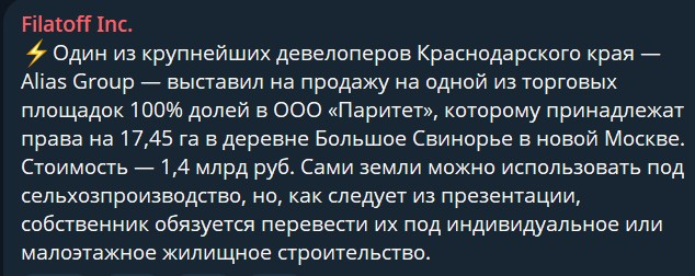 🤓Регионалы выходят из московских проектов. Вот, краснодарский застройщик Алиас решил не связываться с Большим Свинорьем.