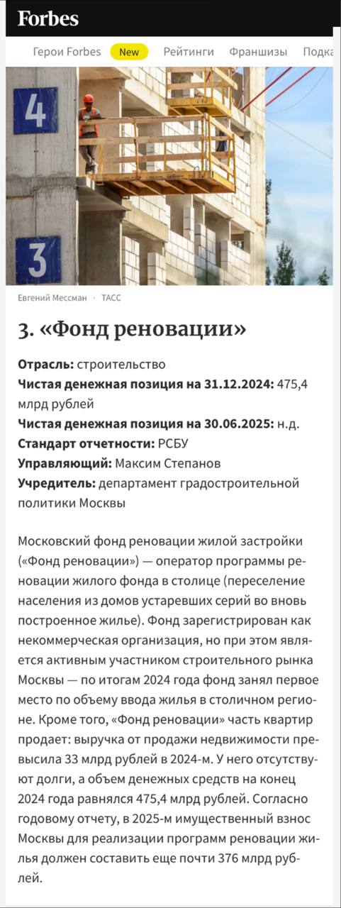🤓Обнаружился самый богатенький Буратино из отечественных застройщиков. Им становится — Фонд Реновации. Именно он занимает третье место, между Лукойлом и Интер РАО в рейтинге ТОП 10 российских компаний с наибольшими запасами денежных средств — 2025 от Forbes.