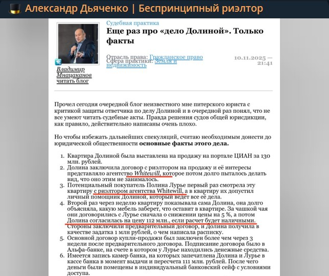 ⚡️Квартиру Долиной продавал Whitewill. Дьяченко нашел бонбу.