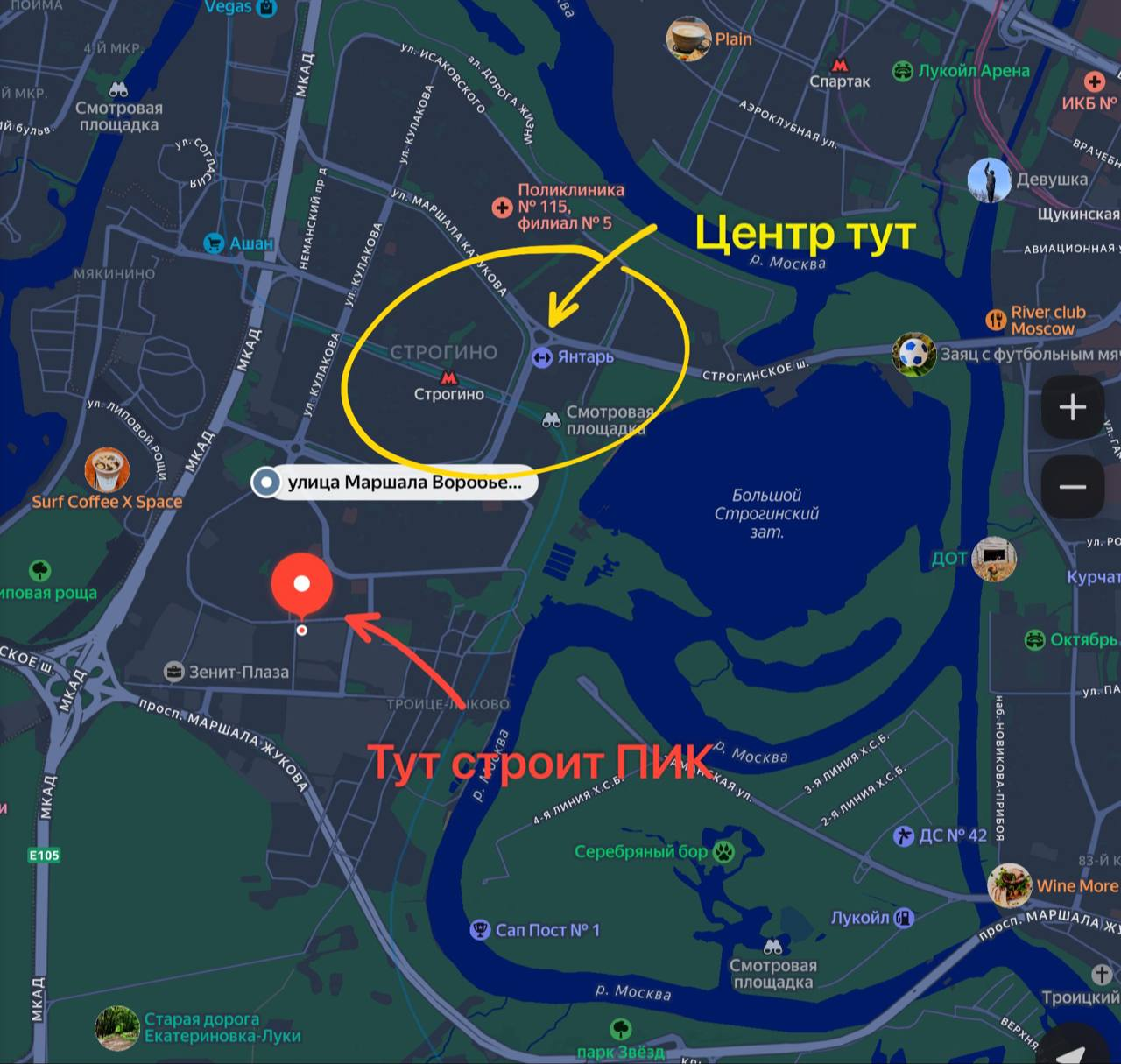 Центр Строгино примерно тут. А там где планирует строить ПИК — его копчик. Многие жители Строгино, там вообще никогда не бывали.