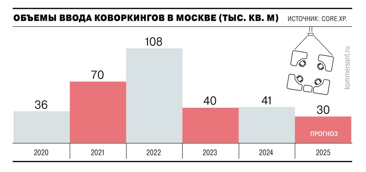 Спрос на коворкинги по итогам трех кварталов 2025 года рухнул на 72% год к году, до 17,4 тыс. кв. м. И это на фоне существенного роста арендных ставок в сегменте: по данным на октябрь этого года, аренда одного рабочего места подорожала на 54% год к году, до 56 тыс. руб. в месяц.