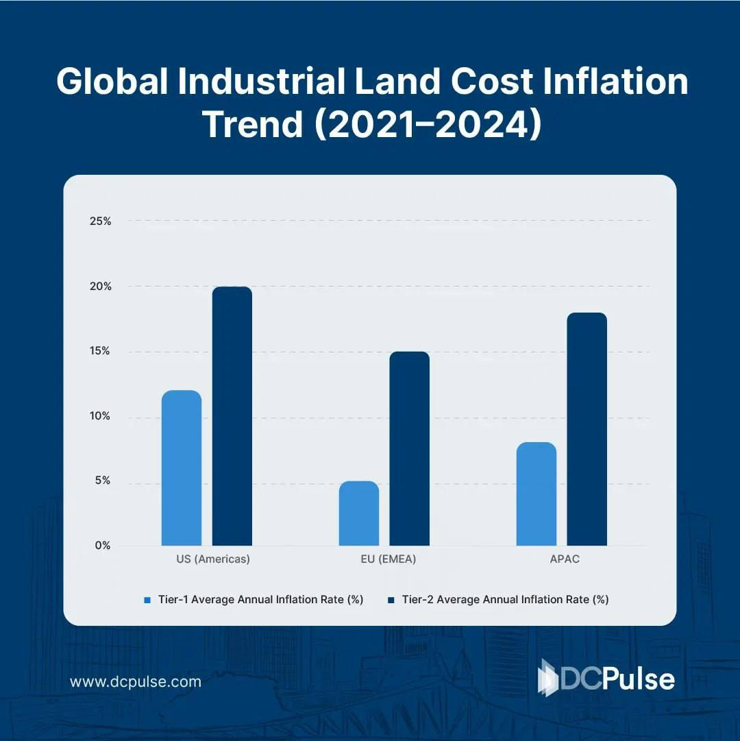 Стоимость промышленных земель в период с 2021 по 2024 год выросла наиболее резко в США (первичные города: 12%, вторичные: 20%) и Азиатско-Тихоокеанском регионе (первичные: 8%, вторичные: 18%), в то время как в Европе рост был более умеренным (первичные: 5%, вторичные: 15%), что связано с бумом строительства дата-центров для искусственного интеллекта.