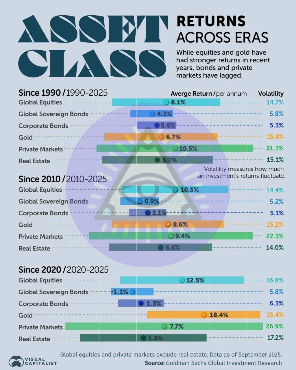 🤔Недвижимость демонстрирует разочаровывающие результаты в последние годы: если с 1990 года средняя годовая доходность составляла 5,7%, то с 2020 года она упала до всего 1,9% при высокой волатильности 17,2%.