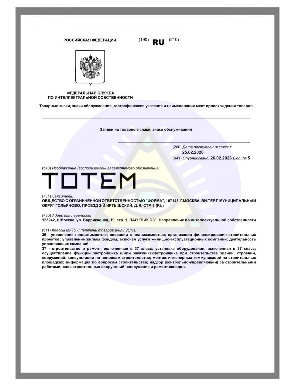 Товарный знак подан на регистрацию в законном порядке, на русском языке.