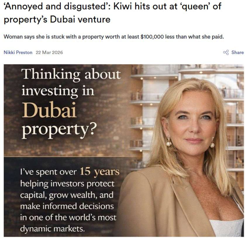 Несмотря на это, Коннорс продолжает продвигать свои услуги по инвестициям в недвижимость за границей, включая Дубай, хотя в Новой Зеландии ей запрещено работать с клиентами. Финансовый регулятор страны предупреждает инвесторов о рисках сотрудничества с зарубежными брокерами, где местные защитные меры могут не действовать.