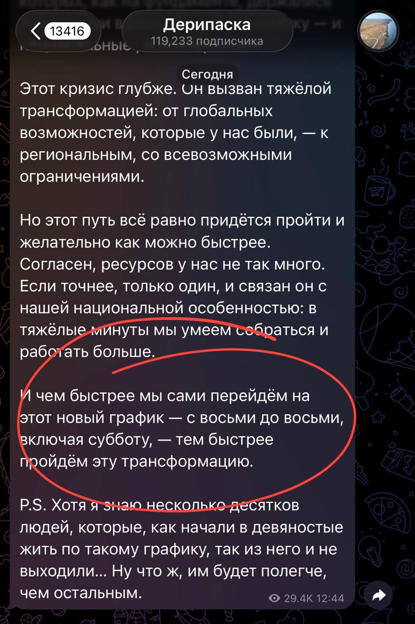 🤔Дерипаска рекомендует работать по 12 часов 6 дней в неделю. Сотрудники Главстроя вздрогнули.