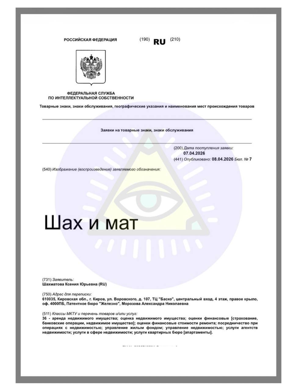 😂Риэлтор Шахматова регистрирует товарный знак «Шах и мат». По крайней мере — не скучно.